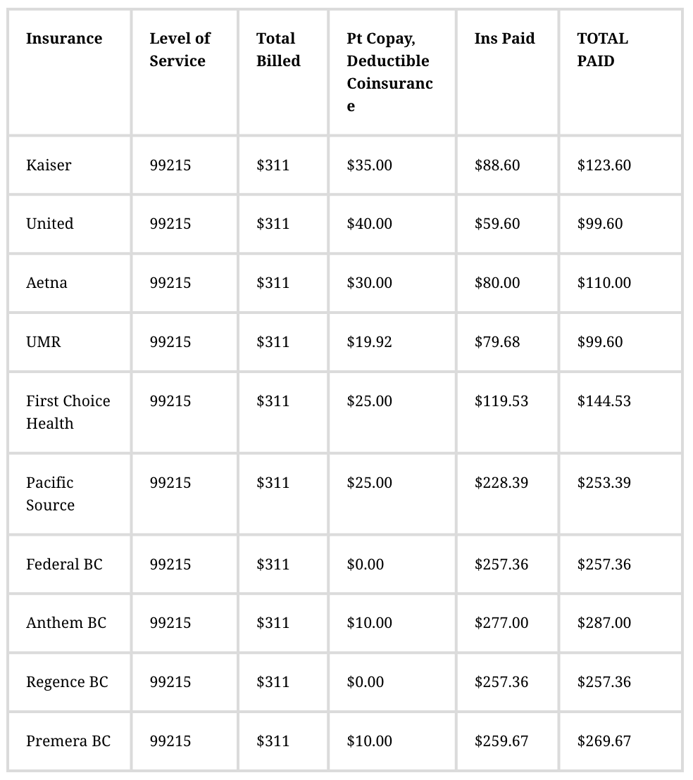 For myself, as an independent contractor, I decided to have most of my visits for 45-minutes in length and generally covered a few to several chief complaints. These visits also usually included checking in and discussions around determinants of health (How are you sleeping now? How are those nutrition changes coming along? How is your support system?) + education around the condition, labs or changes being made. This almost always put into the 99215 category most of the time, and usually much over the 40-minute limit. Our office charged out to insurance $311 for a 99215, less the patient co-pay. See below for the wide variation in what insurance decided to payout - and keep in mind I saw 50-60% of this payout after contributions to the clinic fees: