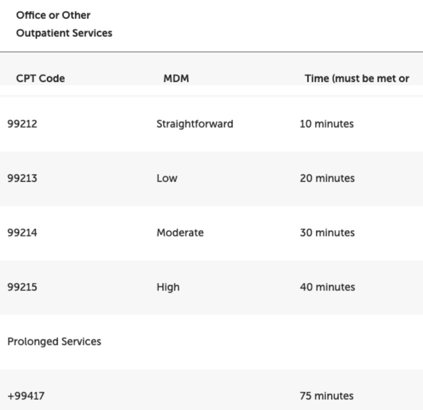 I may be getting too technical, but I really do think it is important for people to know what and how they are being charged, and how their doctor is being paid. Doctors taking insurance bill out codes based on their time (this recently changed from medical complexity model in 2021). The general codes for visits oriented a problem (ie, I have reflux and need help) are as follows, which includes time preparing (reviewing labs, any “presearch” for a condition), time in the visit itself with the patient, and time after the visit (finishing the chart, reviewing records, putting in new prescriptions or lab orders, calling other providers for coordination, etc.):